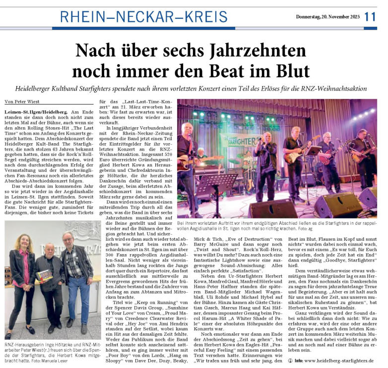 Die Ära einer Heidelberger Kultband geht zu Ende -hausgemachte Band-Musik von 1962 bis 2025/2026.Das war und ist wohl immer noch eine traurige Nachricht für alle, die unsere Musik und uns lieben. Ja, es ist wahr - die Starfighters ziehen sich musikalisch auf ihr Altenteil zurück. Schließlich gehen wir Ur-Starfighters Manfred, Herbert, Charly und Hans-Peter stramm auf die 80 zu. Viele von euch haben uns und unsere Musikerfreunde Kai Häfner und Christian Gasch am 25. Oktober 2025 bei unserer (1.) Abschiedsparty in der Aegidiushalle in St. Ilgen noch einmal erleben können. Diese Party war ein voller Erfolg, Super-stimmung vom Anfang bis zum Ende. Vorgesehen war sie an sich als letzte Veranstaltung mit den Starfighters. Aufgrund der über-wältigenden Nachfrage haben wir entschlossen, am 21. März 2026 die allerletzte (2.) Abschiedsparty wiederum in der Aegidiushalle St. Ilgen zu veranstalten, bei der all diejenigen den Vorrang für Karten hatten, die bei der 1. Abschiedsparty keine Tickets mehr be-kommen haben. Nun gibt es aber leider für die 2. Abschiedsparty aktuell schon wieder keine Karten mehr. eine dritte Abschiedsparty wird es definitiv nicht geben. Auch bei der 2. Abschiedsparty wollen wir und unsere Musikerfreunde es noch einmal so richtig krachen lassen und den Teilnehmern die Gelegenheit geben, bei unserer tollen Musik der 60er Jahre noch einmal richtig abzurocken..Wir freuen uns auf das abschließende Event und auf euch.